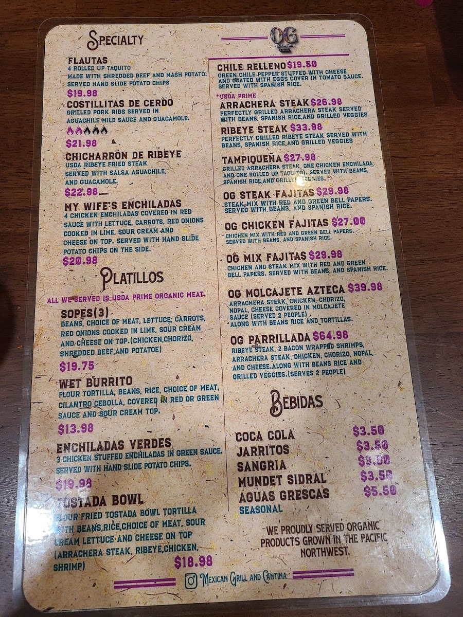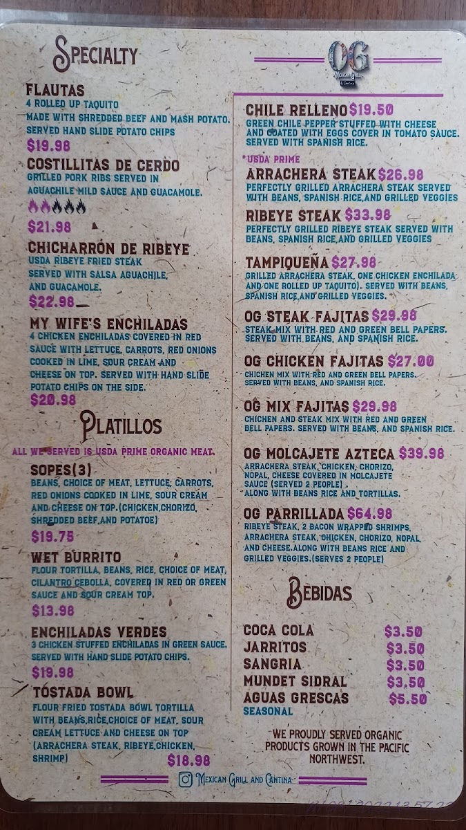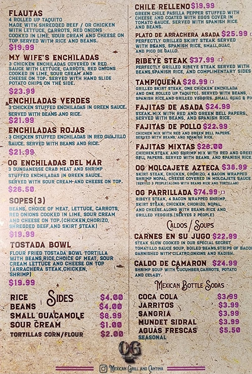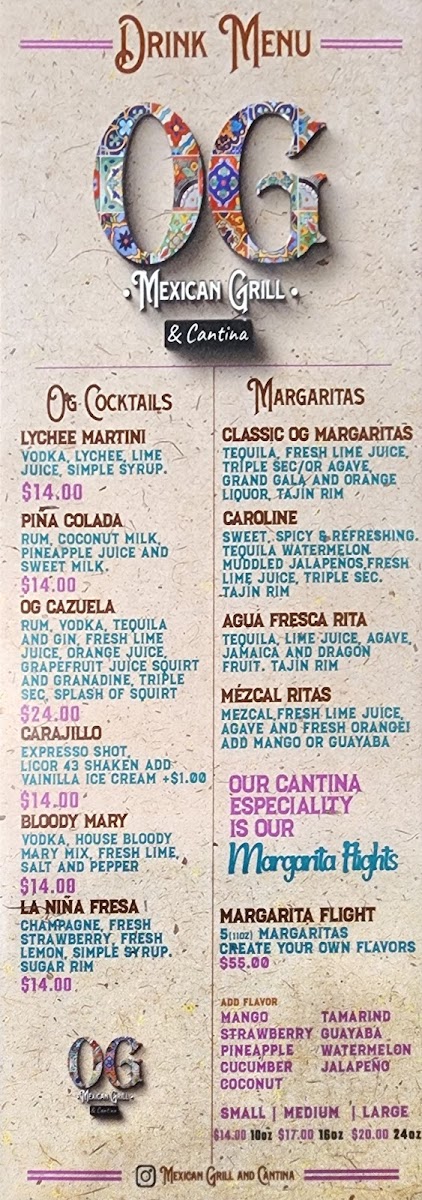 Looking for bold, flavorful Mexican dishes that will make your taste buds dance? The Og Mexican Grill & Cantina Menu at 18385 SW Tualatin Valley Hwy in Aloha has everything you need for an unforgettable dining experience. Whether you're craving sizzling fajitas, mouthwatering tacos, or the rich taste of enchiladas, this menu is packed with options to satisfy all your Mexican food cravings. Don’t forget to explore their unique take on classic favorites like burritos and quesadillas, all made with fresh, high-quality ingredients. Plus, with a variety of tasty sides and drinks, you’ll be able to customize your meal to fit your vibe. Perfect for a casual meal with friends or a family night out, Og Mexican Grill & Cantina is sure to become your go-to spot for authentic Mexican flavors.